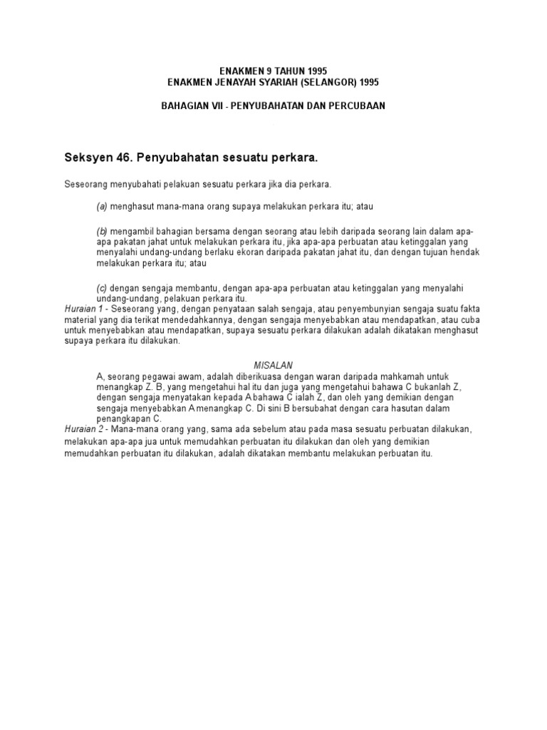 4796 MAKA INILAH DIPERBUAT UNDANG-UNDANG oleh Badan Perundangan Negeri. Salah satu kesalahan jenayah di negeri Selangor. 1 Enakmen ini bolehlah dinamakan Enakmen Jenayah Syariah Selangor 1995 dan hendaklah mula berkuatkuasa.